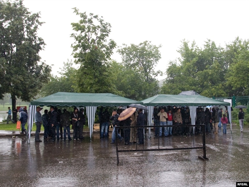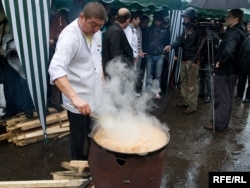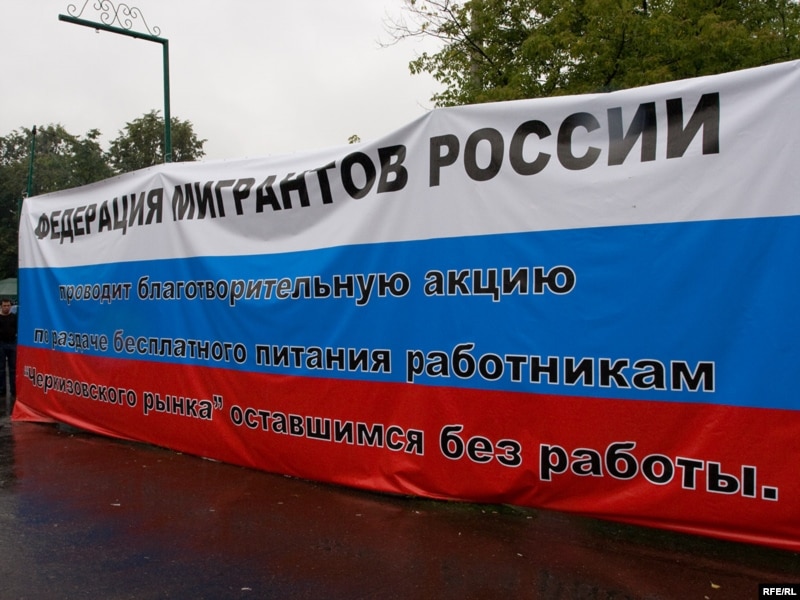 15:00. Чтобы найти полевую кухню, корреспондентам Радио Свобода пришлось под дождем обойти весь Черкизовский рынок – пустой, закрытый более недели назад за нарушение пожарных и санитарных норм. Через час после заявленного начала акции кухню удалось найти. Оказалось, милиция трижды за этот день меняла место размещения кухни.
