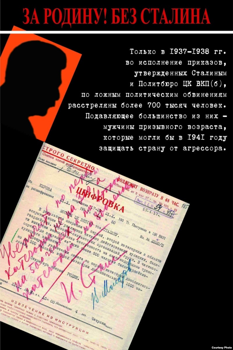 Плакат, подготовленный "Мемориалом", рассказывает об увеличении Сталиным квот на расстрелы в 1937 году