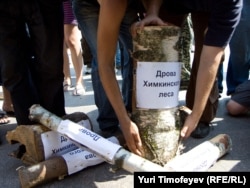 Защитники Химкинского леса и представители "Левого фронта" провели акцию у Белого дома. Евгения Чирикова и ее товарищи привезли с собой уничтоженные вырубщиками деревья - к бревнам прикреплены листки с надписями "дрова из Химкинского леса". Активисты собирали подписи под обращением к правительству России с требованием прекратить вырубку. Акция была пресечена милицией.
