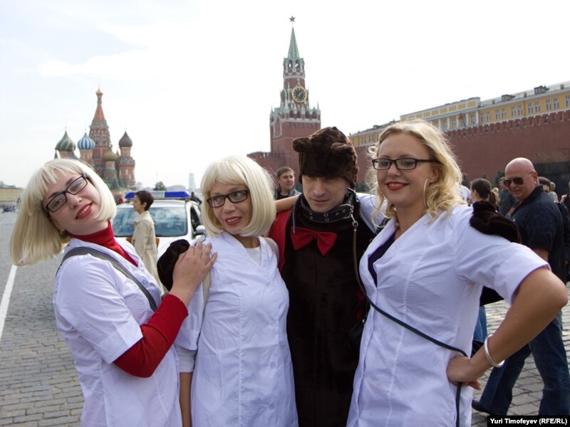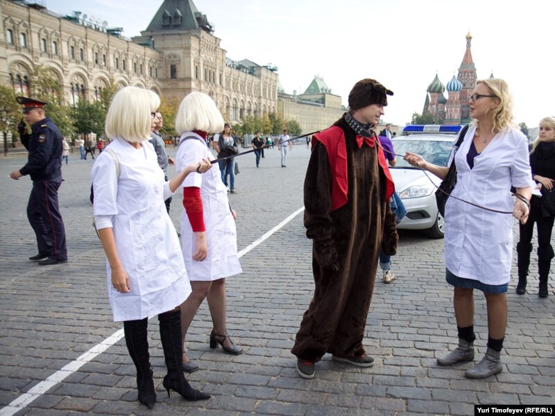 Несколько лет назад, в 2004 году, когда сложилась похожая ситуация с лекарственным обеспечением, активисты пристегивали себя наручниками к зданию Министерства здравоохранения и социального развития. Сейчас за подобную акцию (и даже просто за участие в не согласованном с властями пикете) можно поплатиться свободой. Поэтому три девушки в белых халатах, ведущие на поводке "медведя" по Красной площади, на вопрос милиционера, что они здесь делают, ответили, что всего лишь фотографируются на память, а не иллюстрируют этой сценкой балаган в Минсоцздраве. Однако эта уловка не помогла избежать задержания и все четверо участников акции были препровождены в ближайшее отделение милиции.