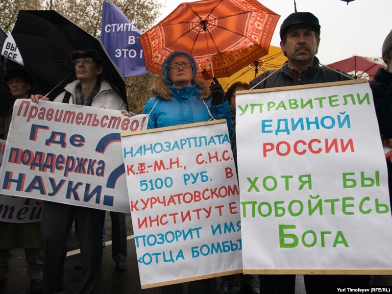 А вот ставка кандидата наук в знаменитом Курчатовском институте: 5100 рублей. "Курчатовцы" держат плакат: "Устроители Земли Русской! Побойтесь хотя бы Бога!"