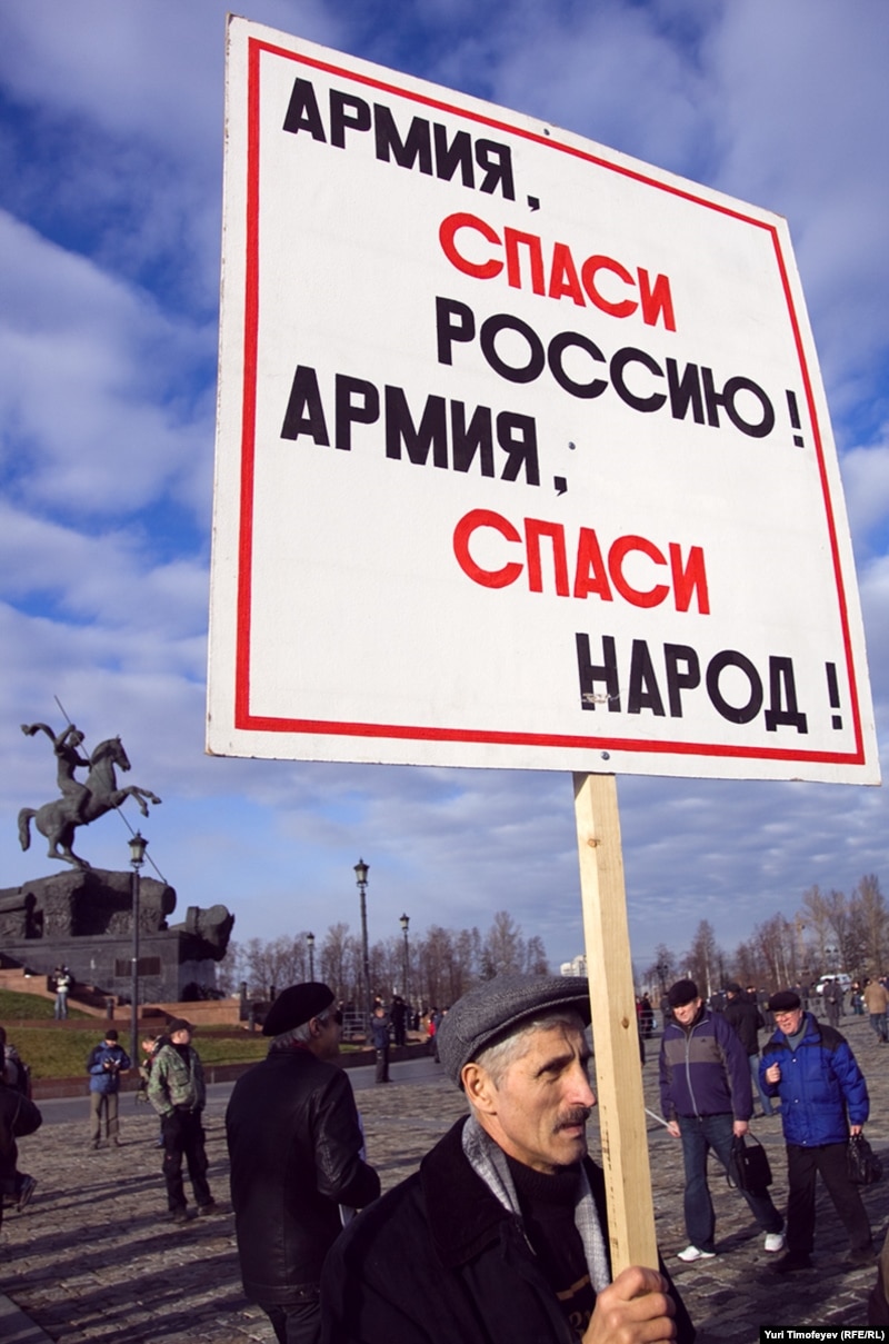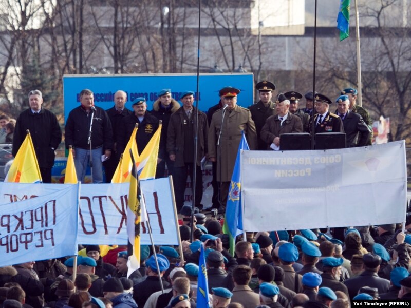 "Армия – спаси Россию, армия – спаси народ", "Русский, помоги русскому, иначе ты будешь следующим", "Министр мебельщик – позор России", "Прекратить военную реформу по-сердюковски!". С такими лозунгами собрались на Поклонной горе несколько тысяч ветеранов ВДВ.