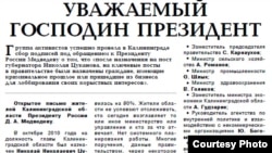 В Калининграде сотрудники регионального Центра по борьбе с экстремизмом совместно с ГИБДД изъяли весь тираж газеты "Известия Калининграда", где было опубликовано открытое письмо калининградцев президенту РФ с требованием отставки регионального правительства. Изъятие состоялось накануне ожидаемого визита Дмитрия Медведева в Калининградскую область.