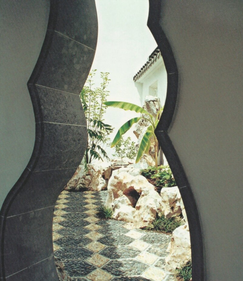 Первый из них - стена сада. Чуть выше человеческого роста, она повторяет изгибы местности, будто вырастая из самой земли. Цвет стены всегда белый. В лунную ночь на ней, как на экране, разыгрывается танец теней, отброшенных побегами бамбука.