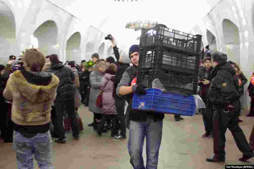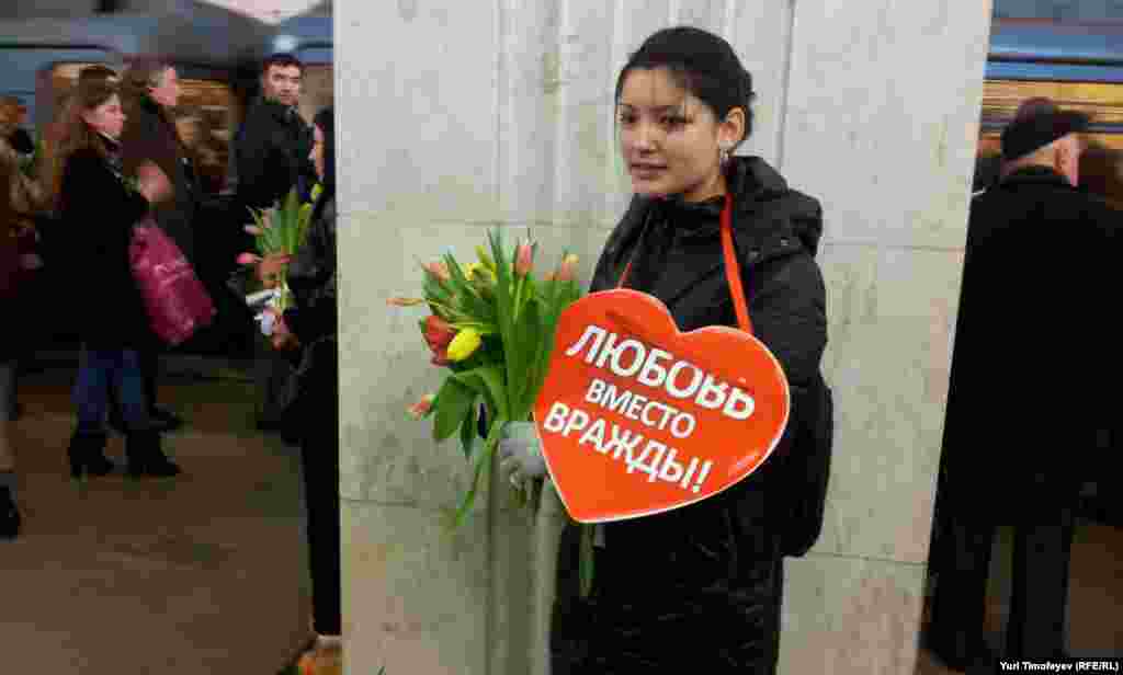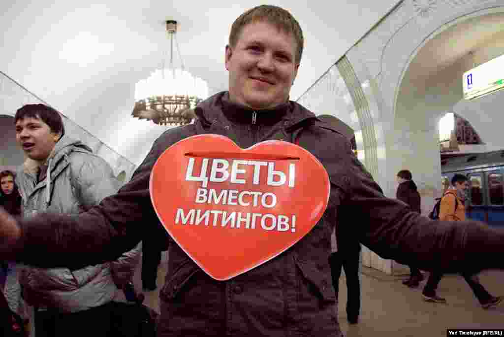 На нескольких станциях метро активисты с табличками: "Весна вместо митингов", "Тюльпан вместо Майдана", "Москва цветам поверит" и "Любовь вместо политики" встречали пассажиров и дарили им букет тюльпанов.