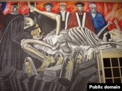 Александр Генис: Ветер революций вновь веет над миром, и, может быть, поэтому такой актуальной кажется выставка в Нью-Йорке мексиканского художника-революционера Диего Риверы, разговором о котором мы откроем ''Американский час''. Для этого разговора мы отправимся в Музей современного искусства, развернувший поразительно богатую историческими деталями экспозицию, связанную с важными событиями художественной истории двух соседей — Америки и Мексики. Моя первая встреча с мексиканскими муралистами произошла лет тридцать назад и оставила неизгладимое впечатление. А началось все с того, что я отправился к Лосеву в Нью-Хэмпшир. Приглашая в гости, Лев Лосев, замечательный поэт и профессор не менее выдающегося Дартмутского колледжа, объяснял дорогу в свойственной ему педантичной манере. Но, перечисляя названия шоссе и номера выездов, он незаметно увлекся и раскрасил маршрут поэтическими атрибутами, упоминая березовые рощи, поля клюквы и гранитные кряжи нашей с ним любимой Новой Англии. Заслушавшись, я чувствовал себя Красной Шапочкой, получающей инструкции от волка. Однако поэзия с прозой составила столь удачный коктейль, что мне без труда удалось найти университетский городок. Осмотр достопримечательностей Лосев начал с библиотеки, которая отличалась чудной просветительской архитектурой, напоминающей о Филадельфии и Петербурге. Внутри этого мирного и ясного здания скрывался жутковатый сюрприз - фрески Ороско. В начале 30-х годов попечители университета пригласили расписать библиотеку одного из трех китов мексиканского мурализма Ороско. Его земляки называли ''неистовым Хосе''. Он изобразил ''Американскую цивилизацию'', так называется это произведение, в 24-х панелях. На стене чинной библиотеки клубились боги, герои и трудовые массы. Живопись Ороско явно сворачивала влево от центра, особенно там, где он добрался до актуальной для университета темы образования. Фрагмент ''Боги современного мира'' показывает профессоров, принимающих роды у скелета. Мертворожденное знание, запертое в стенах кампуса.