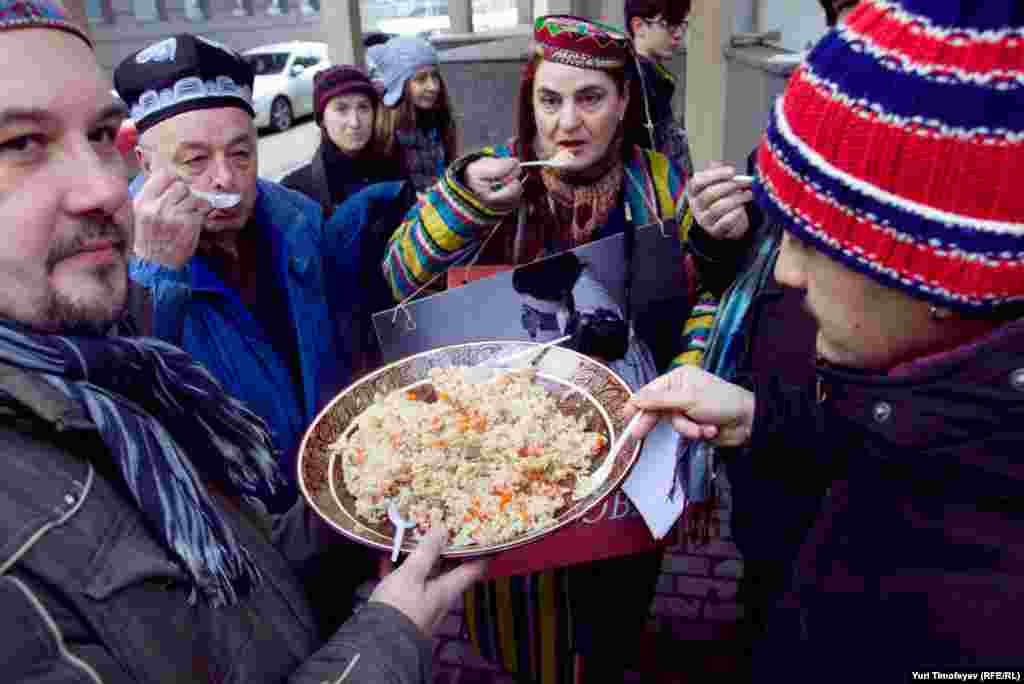 Московские журналисты и фотографы провели у посольства Узбекистана "плов-пикет" в защиту прав фотожурналистов.