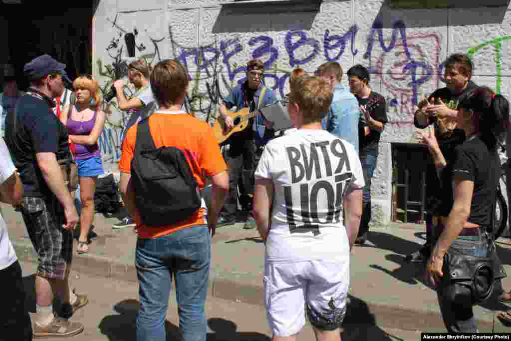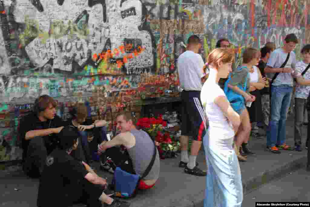 Поклонники творчества Виктора Цоя отмечают его юбилей у "стены Цоя" на Новом Арбате в Москве. Легендарному музыканту 21 июня исполнилось бы 50 лет. Фото Александра Скрыльникова.