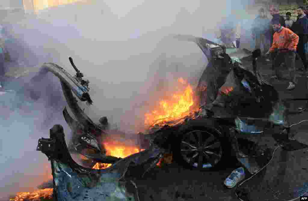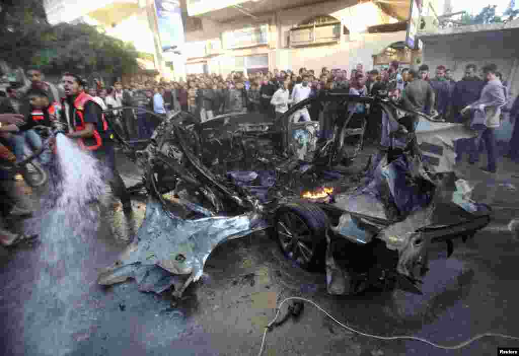 Палестинцы пытаются потушить машину Ахмеда аль-Джабари после того, как 14 ноября в нее попала израильская ракета.