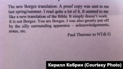 Вот, кстати, специально заготовленные Ди Джованни цитаты из этих писем Теру и Зонтаг; Норман передал мне их через Анну Асланян, которая брала у него интервью для Радио Свобода (оно прозвучало более трех лет назад в программе Дмитрия Волчека "Поверх Барьеров")