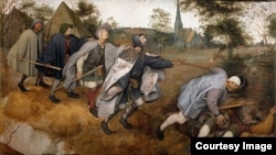 Название неточное, оно почти наверняка не принадлежит самому автору – в Евангелии от Матфея, к которому здесь отсылка, такой притчи нет, Иисус просто прибегает к метафоре, осуждая фарисеев: "Если слепой ведет слепого, то оба упадут в яму". Для Брейгеля религиозные сюжеты вообще не очень характерны, он известен в первую очередь как летописец повседневной жизни сельских обитателей, своих современников, но всегда с мягким подтекстом – обычно это благожелательная ирония, смешанная с грустью, даже если изображен апофеоз веселья.
