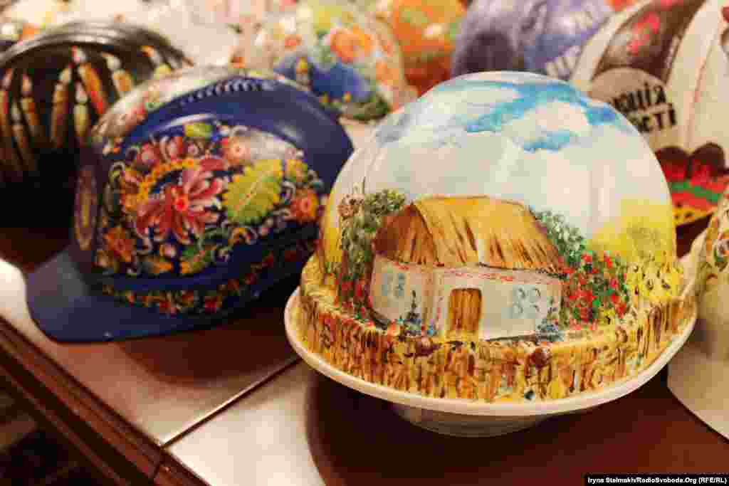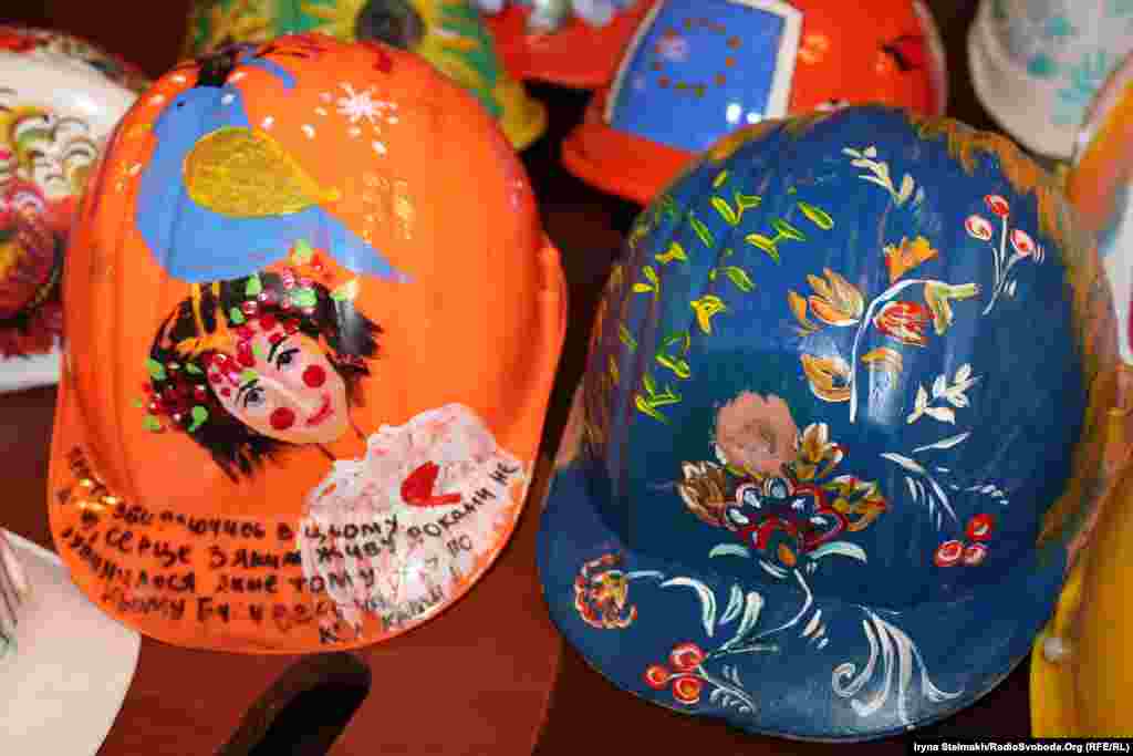 Украинские художники решили поддержать Евромайдан. На выставке в Украинском доме - более 100 касок, с помощью которых протестующие пытались защитить себя от полиции. (Фото Ирины Стельмах, Украинская служба Радио Свобода)