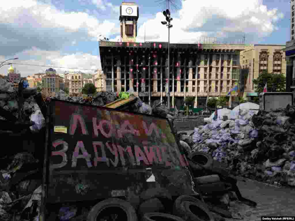 Виталий Кличко, избранный мэром Киева, и представители Майдана обсуждают будущее центра украинской столицы. Кличко предложил убрать баррикады, однако пока свернуты лишь две палатки на Крещатике. 28 мая было подписано заявление сообщества Майдана, в котором говорится, что "Майдан не расходится, пока не выполнены его требования: наказание преступников; люстрация; пакет законов для изменения системы власти; не установлен конституционный порядок в части общин; не наказаны виновные в массовых убийствах; не создана территориальная община Киева по самоуправлению". Эти фотографии я сделал в середине мая, до президентских выборов.