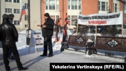 В тридцати метрах от митинга КПРФ "пропутинские" общественные организации развернули одиночный пикет в противовес коммунистической акции протеста. Один человек стоял в окружении флагов "Профсоюза граждан России" и "Георгиевцев". Рядом стояли баннеры с надписями: "Депутаты коммунисты, где ваша законодательная инициатива? Мы готовы вас поддержать", "Активность граждан уменьшит издержки. Создавайте ТСЖ и ТОС". Молодые коммунисты подходили к пикетчику и разъясняли свою позицию относительно "Закона о капремонте".
