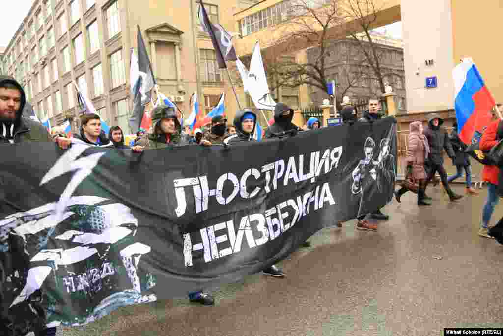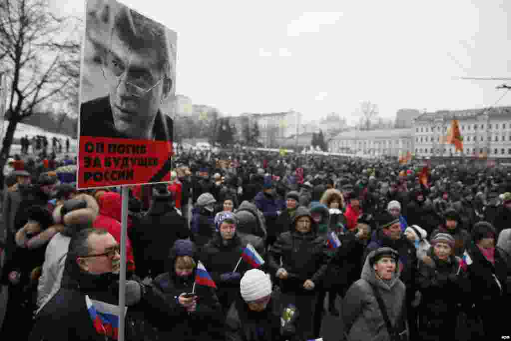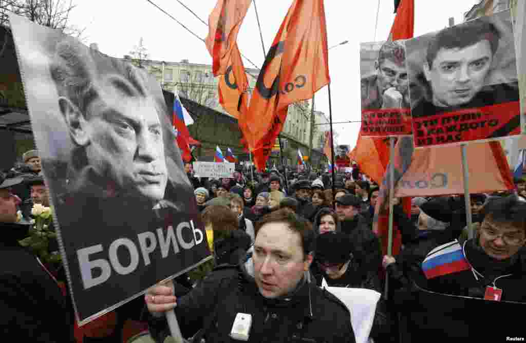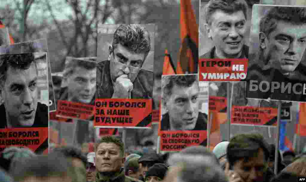 В Москве прошел многотысячный марш памяти убитого лидера демократической оппозиции Бориса Немцова. Участники шествия несли плакаты с его изображением. Немцов был застрелен в ночь на субботу в центре Москвы.