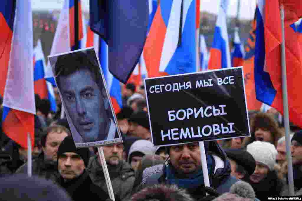 В Москве прошел многотысячный марш памяти убитого лидера демократической оппозиции Бориса Немцова. Участники шествия несли плакаты с его изображением. Немцов был застрелен в ночь на субботу в центре Москвы.