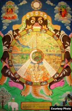 Картины по шелку Осора Будаева поражают не только яркостью, но и скрупулезностью, с которой изображены народные обычаи. Вот картина "Освящение знамени" – ритуал, от которого кровь стынет в жилах: знамя полагалось обрызгать кровью пленника – он и лежит на первом плане, безголовый, а кровь из головы заботливо собирают в чашу. И знамя полощется тут же, сейчас, видимо, оно станет священным. Центральное полотно – "Колесо сансары" с необычными деталями: в сегментах, отведенных человеческим мирам, обычно помещаются символы народов, исповедующих восточные религии, но здесь художник изобразил и символы России: изба, на пороге сидит женщина с ребенком, пасутся гуси, утки, свиньи, есть даже заводская труба с красным флагом, паровоз и самолет. Символ России Будаев ввел в свою танку, буддийскую икону, по просьбе Пандито Хамбо-ламы Агвана Доржиева, который надеялся, что большевистская власть будет лояльна к буддизму.