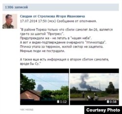 А вот самое известное сообщение, касающееся МН17. Оно появилось в группе "Сводки от Стрелкова Игоря Ивановича" в сети "ВКонтакте". Это не пост, размещенный самим Игорем Стрелковым (Гиркиным), а скорее его "фан-клубом" на основании сообщений с мест. Сразу после того, как стало ясно, что сбит пассажирский самолет, а не военно-транспортный Ан-26, сообщение было удалено.