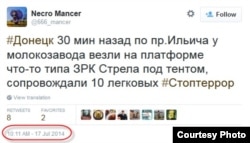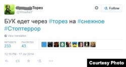 Многие твиты, касающиеся "Бука" (или по меньшей мере крупной единицы боевой техники, которая могла быть "Буком"), были сделаны пользователем @666_mancer. Этот популярный юзер, вероятно, лично не видел описываемые им события, но собирал свидетельства очевидцев с других аккаунтов и делал их перепост у себя. Таким же образом действовал и юзер @WowihaY, который больше не живет в Торезе, но собирает свидетельства местных жителей. Размещение информации о передвижениях сил сепаратистов на собственном аккаунте в соцсетях может быть небезопасным для очевидца, но вполне приемлемым для анонимного юзера или человека, не живущего непосредственно на месте событий. Кроме того, в этих твитах неоднократно используется хэштэг #Stopterror (#Стоптеррор), предназначенный для информирования украинских военных о перемещениях сепаратистов, т.е. речь идет о сборе разведывательной информации местными жителями.