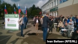Навальный передает микрофон Владимиру Андрейченко. Он был заместителем предыдущего губернатора Слюняева (того самого, который через Министерство регионального развития приземлился в Петербурге и даже сменил фамилию), но после конфликта с начальником ушел в отставку и последние годы политикой не занимался. Владимир Андрейченко согласился поучаствовать в праймериз "РПР-Парнас" и занял на них второе место после Ильи Яшина: