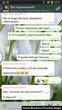 "Нель, щас еду и думаю, если эксп будет на стороне фила, то не будут ли мои действия расцениваться как незаконное содержание под стражей?" – спрашивает она Тростянскую 16 февраля 2015 года.