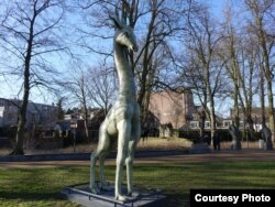 Рядом с мостом, с которого можно было увидеть сферу в воде, располагалась школа. Неподалеку стояли трагические монументы в память об учениках-евреях, которых голландцы не защитили от Холокоста. Рядом – памятник взрослым, погибшим во время оккупации. Историческая ненависть и вина, которая тоже будут бесконечно отражаться. В отдалении, но на той же большой поляне около школы, стояла главная скульптура Босх-квеста – камелопард, гибрид верблюда и леопарда, или жираф. Невиданный зверь, срисованный со средневековой книги, призванный напоминать о масштабе, о разнообразии сотворенного мира, о грандиозном проекте творца.