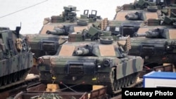 Особый интерес вызывает то, что впервые для участия в учениях в Грузию доставлены больше десяти основных боевых танков сухопутных войск США M1A2 "Абрамс" (Abrams), а также БМП M2 "Брэдли" (Bradley).