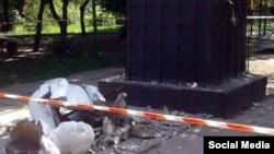 По словам очевидца, утром разрушенный памятник был обнесен лентой. Сообщается, что прошлой зимой этот памятник неизвестные уже обливали желтой и синей краской.