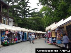 Путь от автовокзала в Алуште к центру города проложен через бесконечные торговые ряды. Здесь продают овощи и фрукты, полотенца, купальники, панамки, сувениры и даже настенные часы с портретом Владимира Путина. Торговля не прекращается и на центральной площади. Через дорогу от здания городской администрации, под табличкой, запрещающей несанкционированную торговлю, женщина продает пучки зелени прямо с земли. Рядом раскинулась ярмарка.