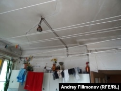 Внутри классическая коммуналка с общей кухней. Покрытый трещинами потолок и голая лампочка, соединенная с электрощитком наружной проводкой.