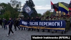 Вслед за "свободовцами" на "Марш нации" от памятника Родине-Матери до Софийской площади с горящими факелами вышли несколько тысяч активистов добровольческого корпуса "Правый сектор", общественной организации "С14" и созданной в пятницу партии "Национальный корпус" ("НК"). Участники шествия держали в руках фотографии бойцов, погибших в Донбассе, плакаты с надписями: "Мир после победы", "Капитуляция - выбор власти" и скандировали: "Украина - превыше всего!"