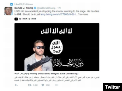 Еще будучи кандидатом республиканцев, Дональд Трамп особенно охотно подхватывал и публиковал у себя в твиттере такие фейки, если они были ему на руку. В марте во время выступления Трампа перед избирателями в аэропорту Дэйтона, штат Огайо, произошел инцидент. Некий молодой человек перепрыгнул через ограждение и оказался на подиуме рядом с кандидатом. Он был немедленно задержан агентами Секретной службы и доставлен в тюрьму. Вскоре в социальных сетях появились сообщения, что нарушитель порядка связан с ИГИЛом. Дональд Трамп сразу же возвестил об этом миллионам подписчиков в "Твиттере" и "Фейсбуке".