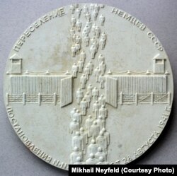 "Я изобразил забор с колючей проволокой, две вышки по бокам и вереницу людей. Реверс – просто шрифт, там написано 1427232 немцев жили в СССР на 18 января 1939 года. Менее 600 тысяч из них вместе с рожденными в депортации выжили в середине 50-х годов. А на второй медали забор, и там внизу перечислены Устьлаг, Севлаг, Ухтпечлаг, десяток лагерей".