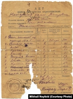"Я ее в целлофан заложил: если на нее дунуть, то она может рассыпаться. Там перечислены размеры дома, мебель какая была, но вычеркнута швейная машинка. Я у матери спрашивал, почему. Это, говорит, когда нас выселяли, украинцы-соседи подошли, попросили отдать: "Все равно вам ничего не вернут", – мы и отдали им швейную машинку".