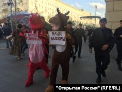 Активисты "Открытой России" в костюмах оленя и рака вышли к московской мэрии на акцию в защиту честных выборов. В руках у них были плакаты "Наши выборы" и "Всех поимели". Полиция их задержала.