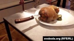 Арт-объект приготовили для выставки белорусские художники Анастасия Гончарова и Павел Юрков, назвавшие его "12 ножей в спину революции". Гончарова рассказала Белорусской службе Радио Свобода, что к 100-летию октябрьского переворота к образу Ленина обращаются многие художники, поскольку он является "мемом" революции. А холодец – это женский способ высказаться на эту тему, ведь "с пищевыми продуктами в течение своей жизни часто работает практически любая женщина" и "быт отнимает у них много времени". Выставка "Другое поколение есть другое пространство", как говорили ее устроители, посвящена революции, но другой – революции в вопросах "женской самоидентификации, роли женщины в обществе и в творчестве".