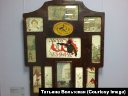 Среди экспонатов выставки есть удивительная работа, несколько картинок разного размера в одной деревянной раме – настоящее житие Ленина – вот он маленький, кудрявый, с октябрятского значка, вот он студент, вот подпольщик – и действительно, этот рассказ о Ленине в картинках вставлен в старинную раму, куда раньше вставлялись другие картинки – жития святых. Другая работа – совсем поздняя, сделанная уже в середине 80-х годов, перед самой перестройкой – она рассказывает, что искусство в СССР принадлежит народу. Вверху – Ленин, как бы на облаке, прямо под ним – ряды людей в белых одеждах, как будто это ангелы с лютнями на небесах, а на самом деле это правильные деятели искусства. Еще пониже другие фигуры – писатели пишут, музыканты играют, Уланова и Сергеев танцуют, и все это великолепие – в характерных красно-золотых тонах. Если не присматриваться к персонажам, первая мысль, возникающая при взгляде на картину, – что это икона.