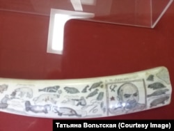 – Когда я пришел работать в музей, меня сразу заинтересовала вот эта работа мастерицы из Нижнего Новгорода – Ленин, вышитый шелком на ткани. Это не произведение высокого искусства, но работа, сделанная с душой – видимо, мастерица искренне любила и уважала Ленина. Я 10 лет проработал в Российском этнографическом музе и вспомнил экспонаты, которые там видел, – Ленина на моржовом клыке, Ленина на ковре, и подумал: интересно было бы собрать работы, которые делали обычные люди. Эти работы, посвященные Ленину, дарили на праздники, их привозили разные делегации, но их делали не столько по чьему-то указанию, сколько от души, от сердца, с трепетом и уважением. Сейчас много выставок – целая лениниана, и плакаты, и работы знаменитых художников, но вот такие скромные вещи есть почти в каждом большом краеведческом музее – портреты Ленина выжигали на дереве, вышивали, ткали обычные граждане, и мне захотелось их собрать. Помог музей Смольного, наследник Мраморного дворца, ленинградского филиала Центрального музея Ленина. У них там замечательные вышивки, ковры, и они мне их с удовольствием предоставили. Музей истории города дал мне фарфоровую вазу и две тарелки с Лениным. Ну и, конечно, сюда вошли предметы из частных коллекций и экспонаты музейного комплекса в Разливе, хотя их немного, потому что сам фонд у нас небольшой, он стал формироваться только в последние 15 лет. Помог и Российский этнографический музей – они дали нам те самые клыки моржа, на которых среди изображений зверей, охотников, традиционных северных промыслов – портреты Ленина, Сталина, Маркса и Калинина. Это произведения известных мастеров, работников Уэленской косторезной фабрики, традиционное аборигенское искусство чукчей и эскимосов, но в 30-е годы туда стали приезжать художники, и это искусство сделалось более тонким и разнообразным. Тут изображены олени, юрты, рыбалка – и в традиционную жизнь вкраплены вожди революции. Очень интересно, как политические деятели входят в традиционное сознание. Наверное, до людей доходили слухи, они чувствовали изменения в своей жизни – вот они и стали изображать Ленина. В основном их интересовала традиционная тематика, легенды, мифы – и вот тут в мифах появляется Владимир Ильич. Он есть и в сказках севера – Ленин прилетает, как орел, и дарит людям свет и свободу, все начинают жить хорошо и весело.