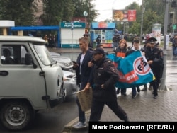 В Кемерове на акции против повышения пенсионного возраста полицейские задержали координатора штаба Навального Стаса Калиниченко, передает корреспондент "Сибирь.Реалий".