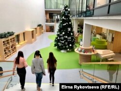 А это сама библиотека. Там под елочкой сидели взрослые девочки и мастерили, как они нам объяснили, интерактивную гирлянду с фотографиями своего класса.