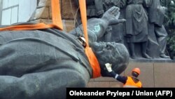 Корреспондент: В отличие от России, в городах и селах которой остаются прежние названия улиц, площадей и памятники советской эпохи, Украина, за редким исключением, попрощались с топонимическим наследием советского периода. В начале 90-х годов в стране насчитывалось около шести тысяч памятников Владимиру Ленину. Сносить их первыми начали в западных областях Украины задолго дособытий 2014 года. Массовый "ленинопад" произошел на востоке и в центре Украины после того, как участники уличных демонстраций в декабре 2013 года разрушили памятник Ленину в центре Киева. Демонтированные памятники эпохи тоталитаризма из разных городов украинские власти предполагают собрать в одном месте и открыть парки монументальной пропаганды СССР.