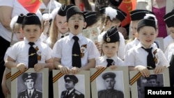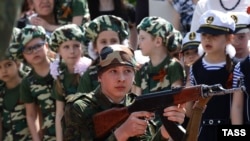 Накануне Дня Победы в нескольких российских городах прошел парад "дошкольных войск". Дети в военной форме с муляжами американских автоматов вышли на шествие в Пятигорске. В подмосковном Чехове, Иванове и Ставропольском крае дети маршировали в форме разных родов войск.