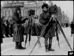Дональд Томпсон (слева), фотограф еженедельника Leslie's, и капитан армии США Кингмор снимают фотографии в движении в Екатеринбурге на рубеже 1919 года. Город в этот момент под контролем Белой армии. Чехословацкий корпус отбил его у большевиков через неделю после расстрела царской семьи в ночь с 16 на 17 июля 1918 года.