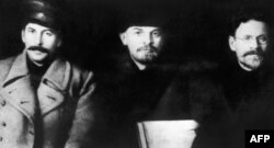 Восьмой съезд Российской коммунистической партии (большевиков) прошел в марте 1919 года. Иосиф Сталин, Владимир Ленин и Михаил Калинин (слева направо) на одной фотографии.