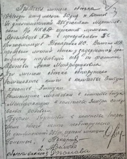 "Папа рассказывал, что все они сильно голодали. Бабушка, жена священника, была очень верующим человеком. После ее ареста НКВД сделал запрос в сельсовет хутора Большемечетный. В ответе-справке говорится о том, что "Дронова А. М. является женой служителя культа (попа), который изъят органами НКВД" и что она "под видом религиозного обряда устраивала сборища, на которых проповедовала религию". Из протокола личного обыска Дроновой А. М. видно, что у задержанной обнаружили "религиозные книги в количестве 3 штуки, крестов 3 штуки, религиозные листовки в количестве 7 штук, мануфактуры в количестве 3 метра ситца цвета розового, туфли брезентовые в количестве 1 пара. Кроме этого ничего не обнаружено".