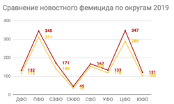 Но вернёмся к нашим цифрам. Для подсчета новостного коэффициента фемицида нам потребовалось узнать численность женского населения по округам и областям. Используя официальные предположительные данные о численности населения России по регионам на 1 января 2019 года был рассчитан Коэффициент новостного фемицида для России 1.89 ☞ не "коэффициент фемицида", а число новостей о фемициде в России на 100 тысяч женщин за 2019 год. Также мы рассчитали коэффициент новостного интимного фемицида 1.63, где мы использовали только новости об убийствах родственниками (включая любых интимных партнеров) и знакомыми. Посмотреть данные по всем регионам можно здесь.