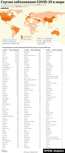 Текущая статистика по числу выявленных случаев заражения COVID-19 в разных странах мира.