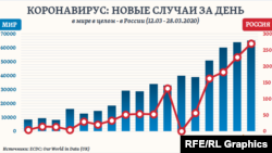 Если сопоставить данные за период после 11 марта в целом по миру с данными по России, то общая их динамика не сильно разнится.