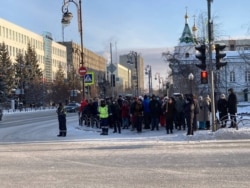 На Соборной площади, как передают Сибирь.Реалии, собрались около полутора тысяч человек. Несмотря на сильный мороз, никто не расходится, люди скандируют "Отравителей в тюрьму", "Путин вор", "Свободу Навальному". Напротив них стоит оцепление из полицейских.