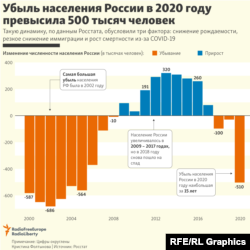 Убыль постоянного населения России в 2020 году, по данным Росстата, превысила 500 тысяч человек. Последний раз такой высокий уровень убыли наблюдался 15 лет назад - в 2005 году.